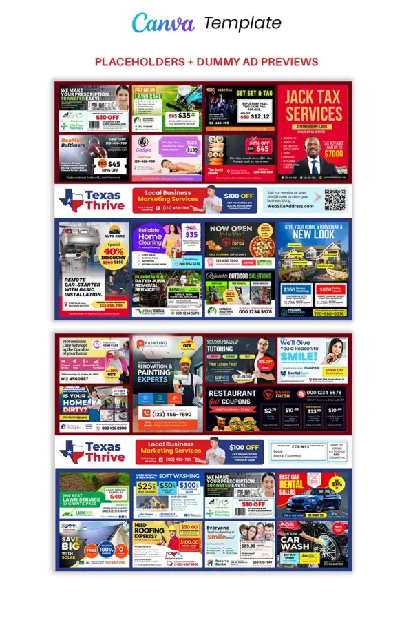 Fully customizable in Canva, this easy-to-edit template includes clearly labeled ad placeholders, smart layout design, and flexible ad slots—ideal for up to 6–8 businesses. Whether you’re selling ad space or promoting a local network of service providers, this layout gives you a polished and professional edge.